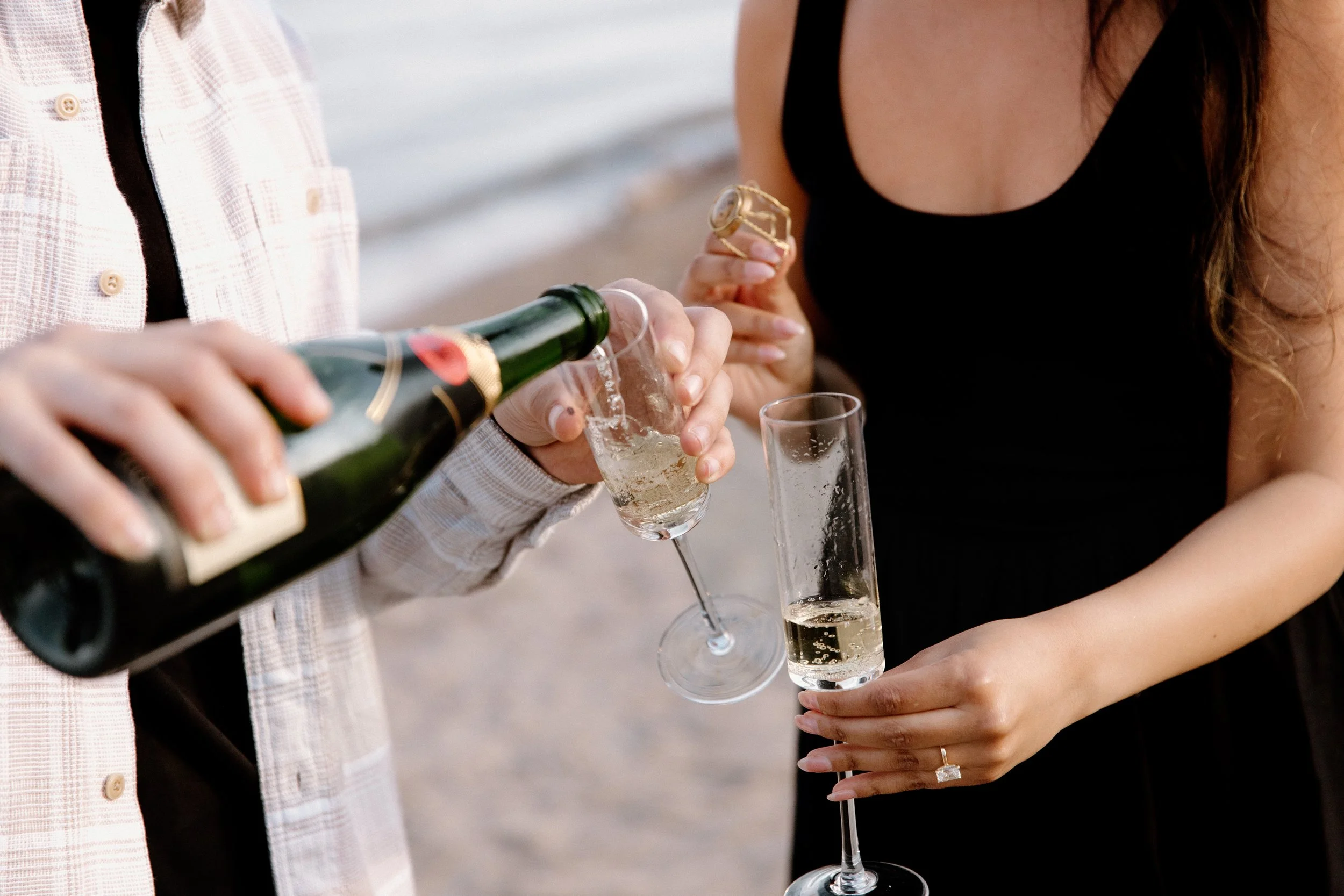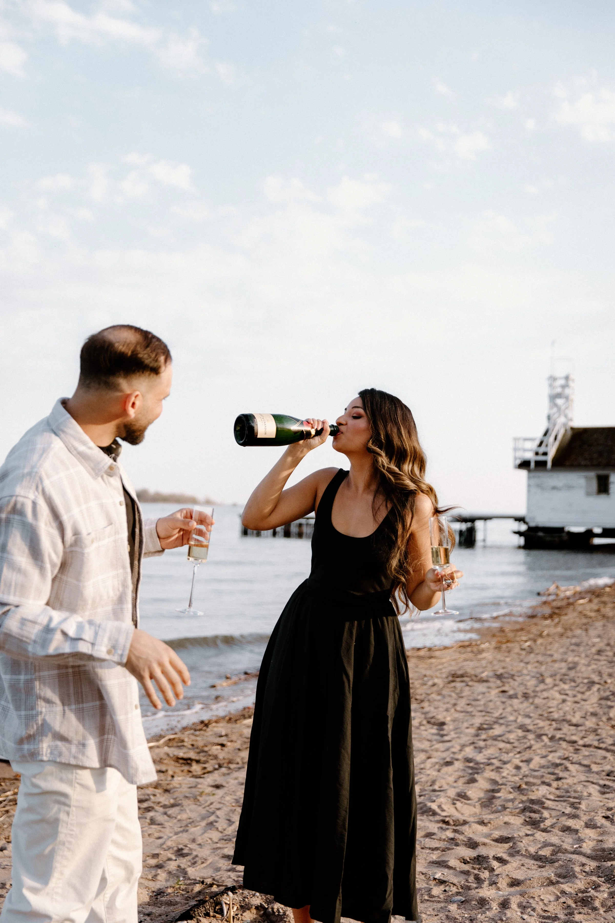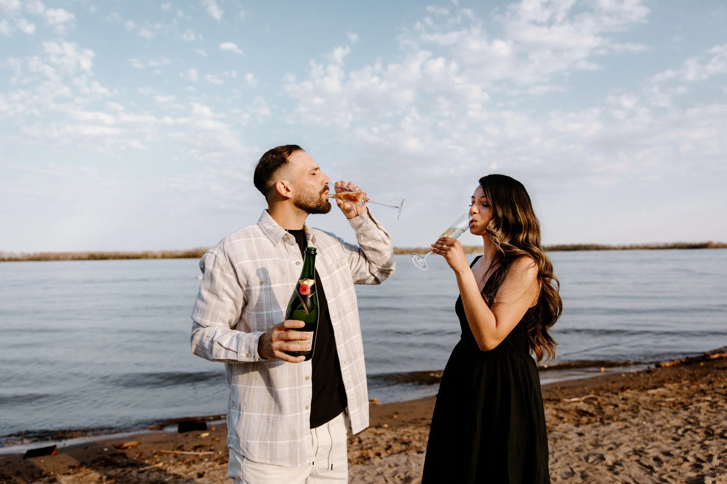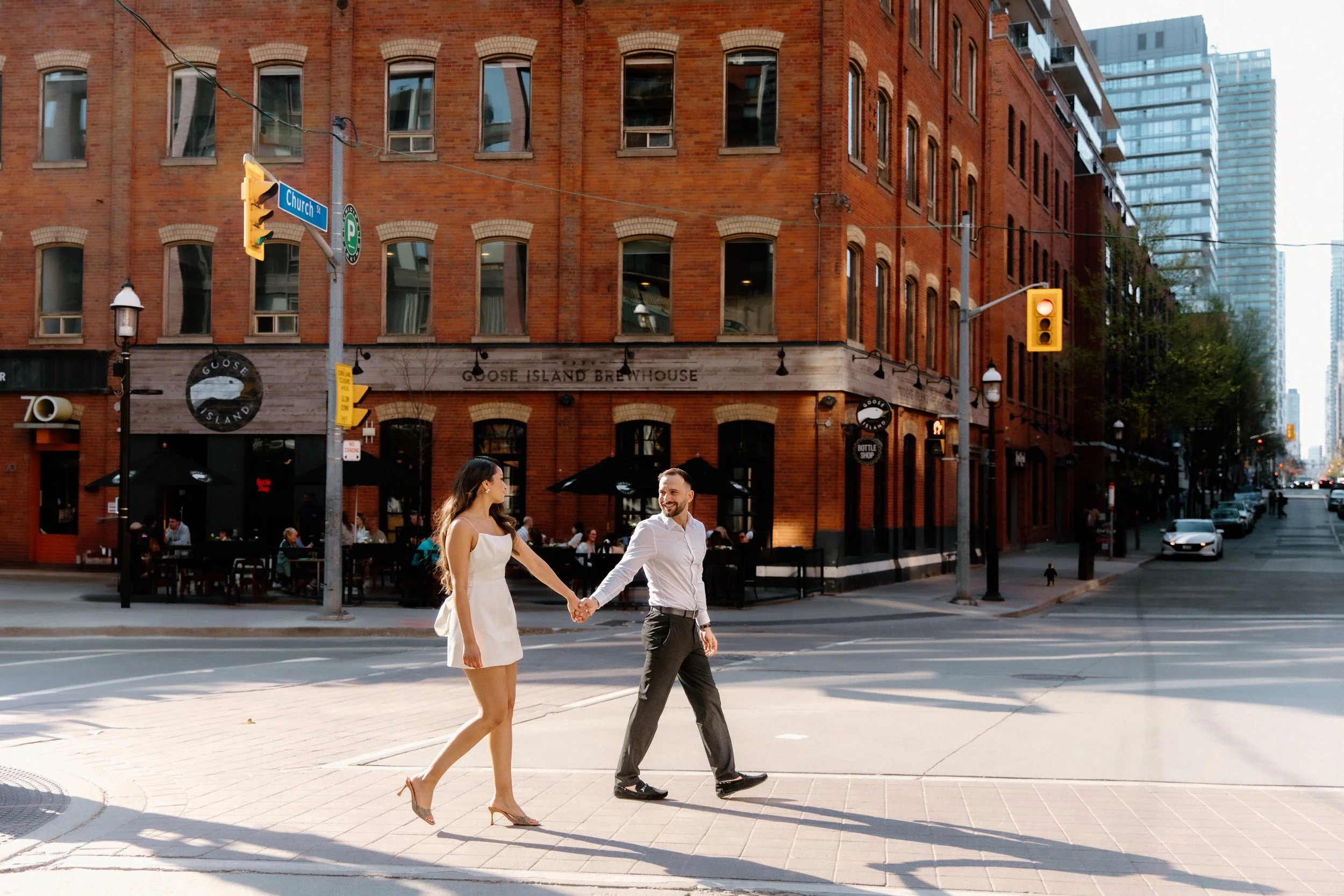 Toronto engagement photography in spring and summer can be tricky, because it is also construction season (booo!) and there was no shortage of bright orange pylons, blocked roads, piles of debris, and equipment sitting around our shoot areas. When Delrene was putting together a moodboard for what they were envisioning for their session— something we always encourage— she pulled a few photos that looked just like the Esplanade area of the city. We love shooting downtown, but being downtown at sunset is not always the most ideal; being surrounded by 50+ storey buildings on all sides make it difficult to actually have a clear line of site to a sunset, so I’m so glad we were able to agree on being around the St. Lawrence Market area instead where you still get the feeling of being in the city without being blocked by banking towers. I’m always so excited when we get to go to multiple locations so after our city vibe we headed to the Polson Pier and Cherry Beach for some waterfront photos with champagne. The perfect end to a perfect evening, wouldn’t you agree?
